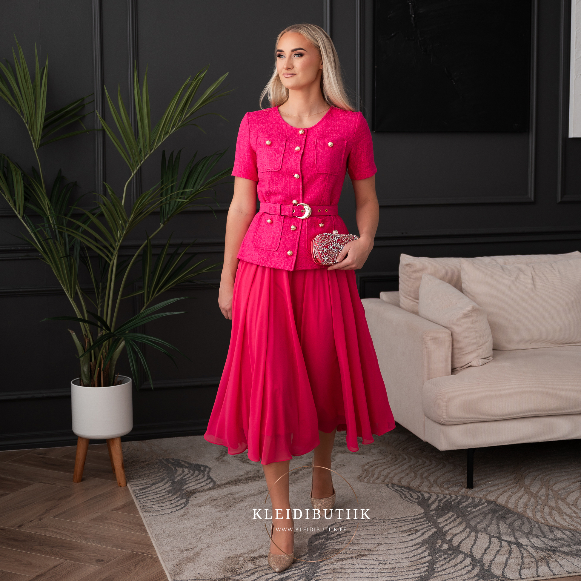 **kohapealt on võimalik osta ka komplektiga sobiv fuksiaroosa kotike (€45) ja shampanjatoonis sädelevad kingad (€39, suurused 36-41).